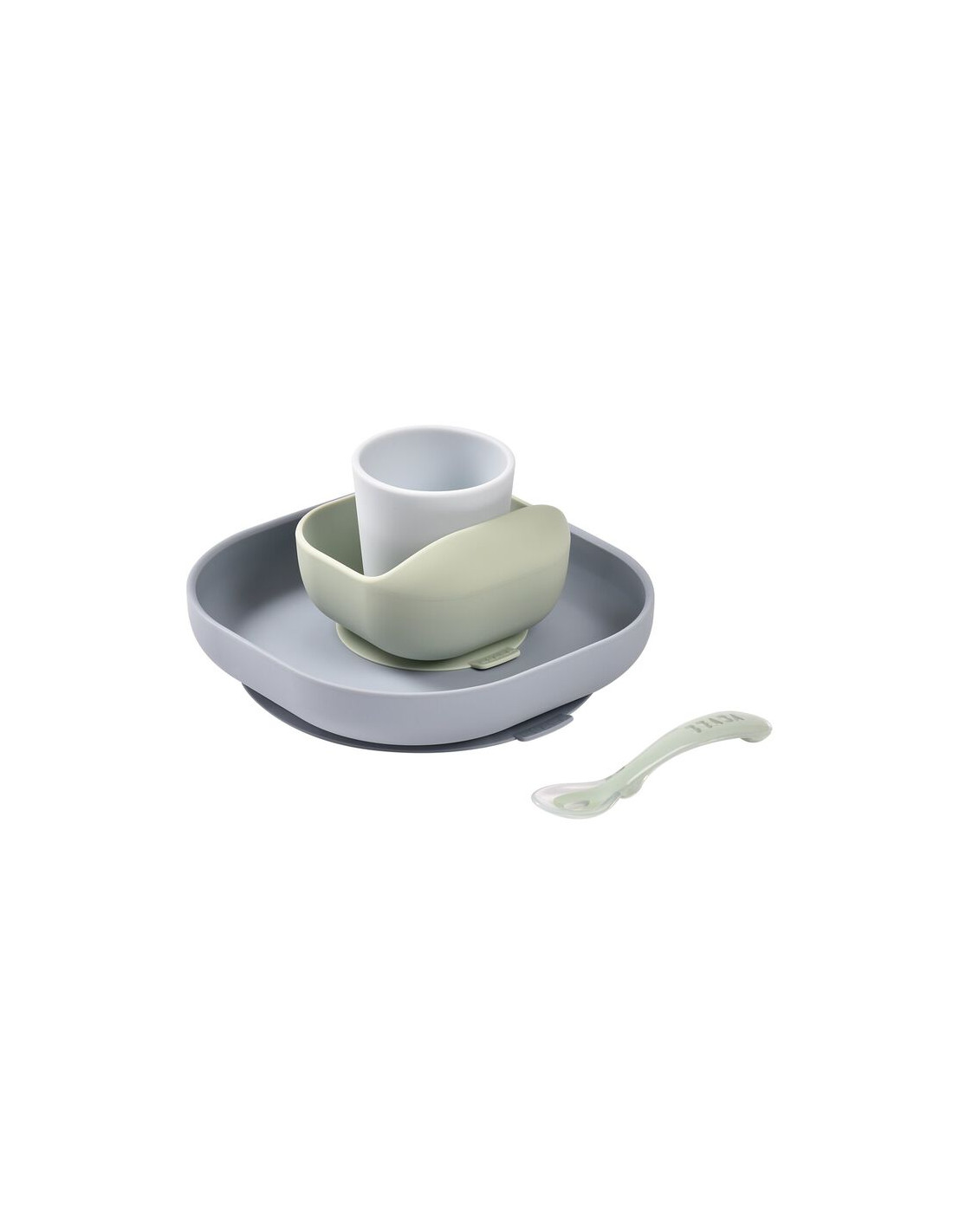 Set vaisselle en silicone de la marque Béaba. Composé d'une assiette, d'un bol, d'un verre et d'une cuillère 2ème âge.