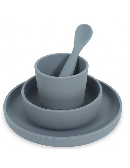 Cet ensemble service pour enfant coloris gris est composé à 100% de silicone alimentaire et se compose d'une assiette, d'un bol, d'une tasse et d'une cuillère. Il y a une ventouse pratique sous la plaque et le bol. Toutes les pièces vont au congélateur, au micro-onde, au four ou au lave vaisselle.