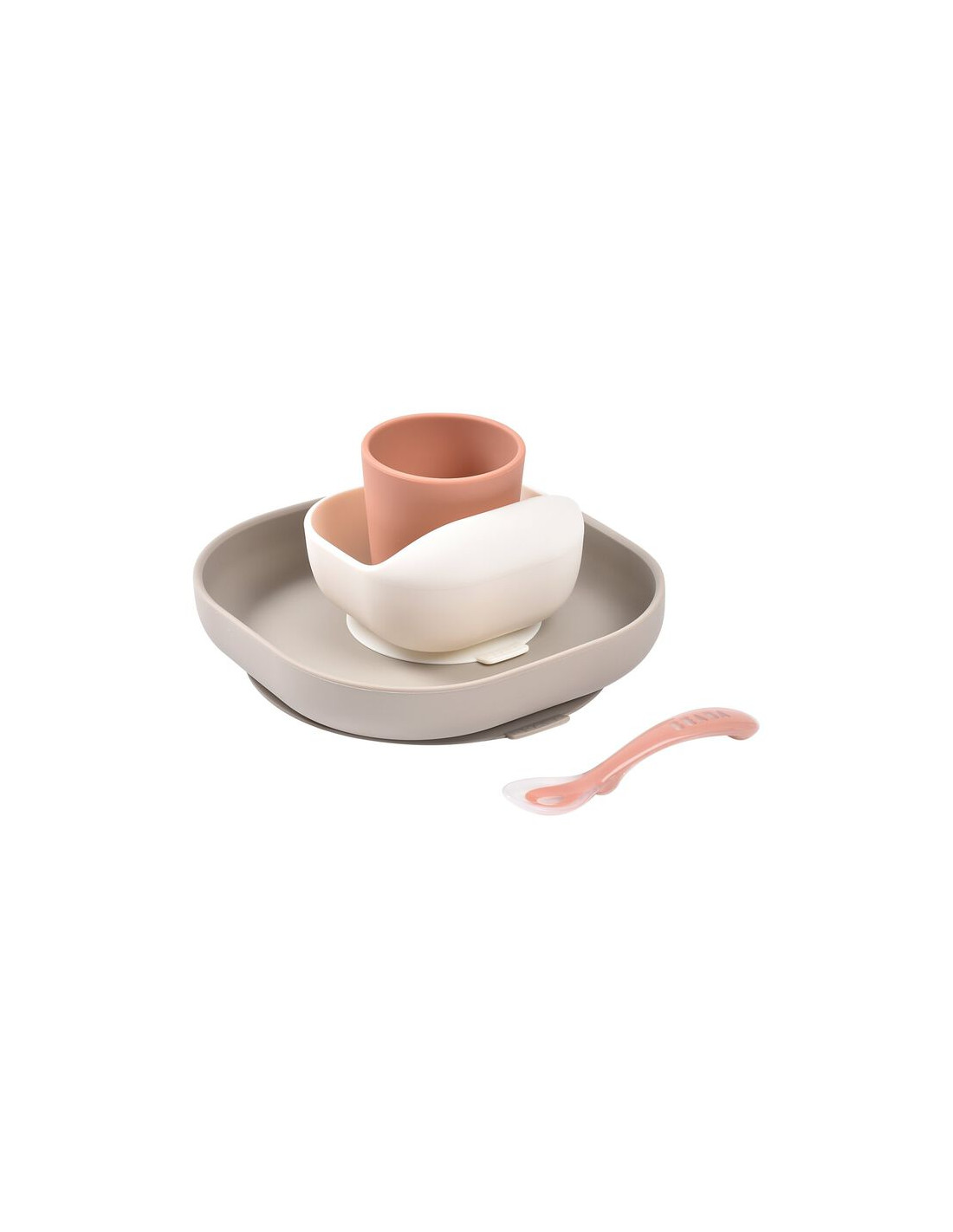 Set vaisselle en silicone de la marque Béaba. Composé d'une assiette, d'un bol, d'un verre et d'une cuillère 2ème âge.