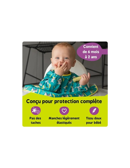Rapide et facile à utiliser, il suffit de retirer la bande auto-agrippante de protection en bas du bavoir et de l'attacher à votre plateau !
