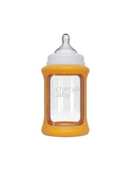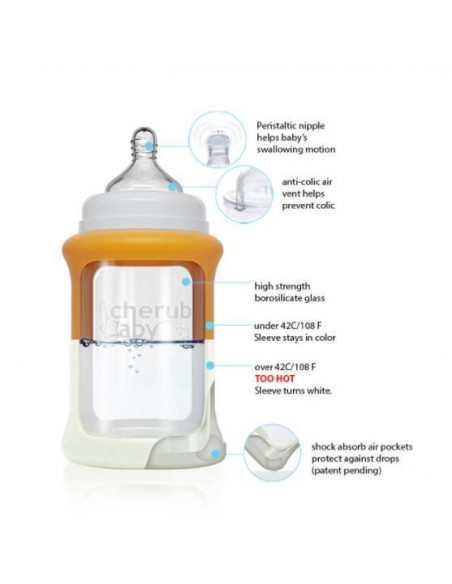 Ce nouveau biberon en verre de haute qualité est muni d'un manchon amovible en silicone qui change de couleur si le liquide à l'intérieur est trop chaud. Il vous garantit un biberon "safe" de toutes substances nocives mais bien résistant en cas de chute.