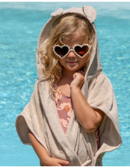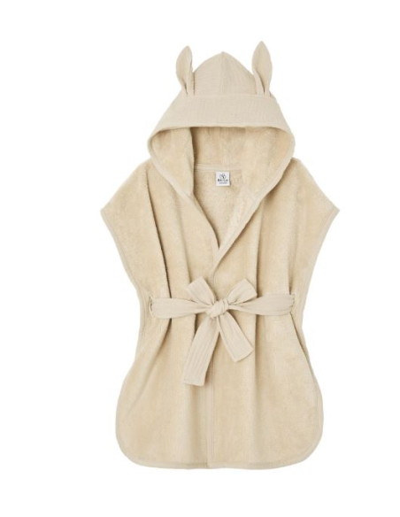 Un adorable peignoir en éponge bambou avec capuche et ceinture en double gaze de coton ton sur ton.