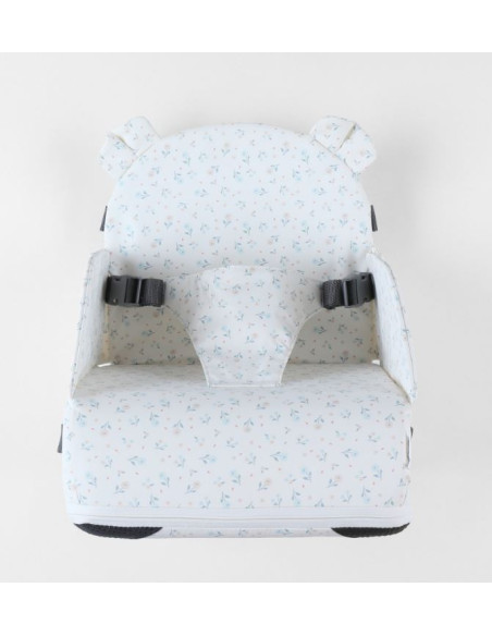 Ce rehausseur, Ecru avec imprimé Fleuri, permettra à votre enfant d'être assis à bonne hauteur pour vos repas en famille confortablablement. Mais aussi tout en sécurtié grâce aux sangles à clips et au harnais. Il est recouvert d’une matière imperméable, pour faciliter son nettoyage. Pliable et léger, il est facile à transporter durant tous vos déplacements grâce aux sangles pour épaules.