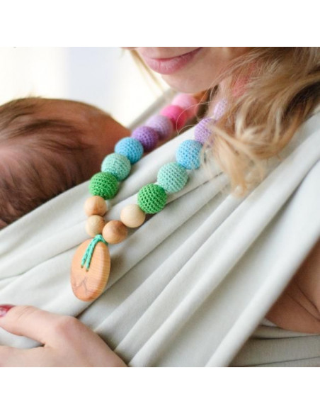 Ce collier aide à l'installation en écharpe du fait qu'il va attirer bébé et le distraire pour faciliter la mise en place de l'écharpe.