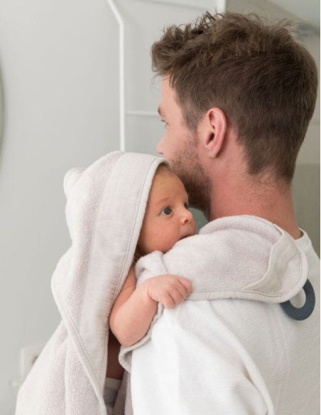Cette grande cape de bain enveloppe bébé de douceur tout en protégeant les parents des éclaboussures. Astucieux, son anneau en silicone permet d’attacher la serviette autour du cou de l’adulte tel un tablier mais aussi d’occuper bébé lorsqu’on le sèche. Pratique, sa grande taille permet de l’utiliser durant de nombreuses années. En coton organique épais pour une absorption optimale.