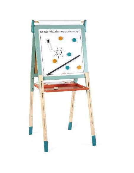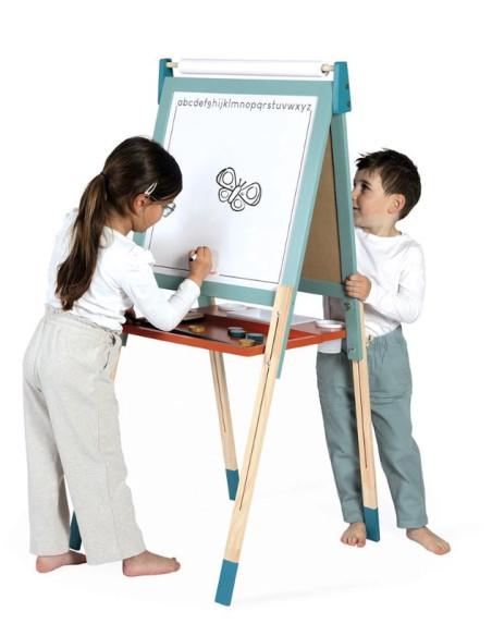 Pour faciliter les réalisations et faire comme à l'école, rien de mieux qu'un tableau double-face où les tout-petits pourront tout autant se familiariser avec les feutres du tableau blanc qu'avec les craies du tableau noir !
