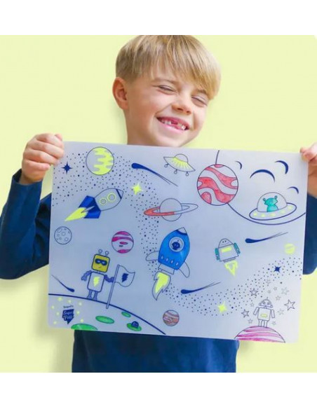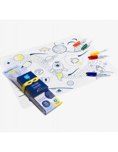 Ce set se plie facilement et s’emporte partout, il suivra votre petit artiste pour tous ses repas ou dans certaines salles d’attente interminables ! Grâce à ses 5 feutres lavables aux encres non toxiques, les enfants pourront colorier à l’infini leurs animaux préférés !