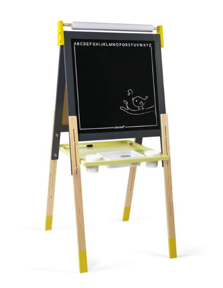 Tableau de dessin en bois de la marque Janod. Deux faces (blanche et noire) et nombreux accessoires. Pieds réglables jusque 126 cm.
