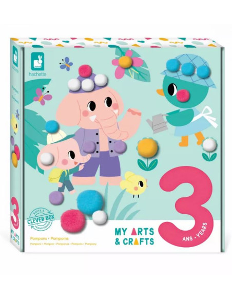 Il est accompagné de 4 supports de tableaux à fabriquer avec la boite et de 150 pompons de 2 tailles et 5 couleurs différentes.