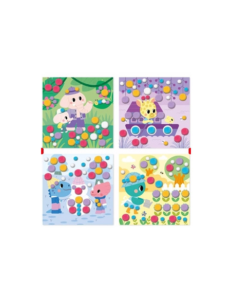 À l'aide du livret d'instructions et des contours colorés des formes présents sur les tableaux, il suffit de coller le pompon de la bonne couleur et de la bonne taille sur son emplacement.