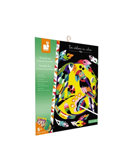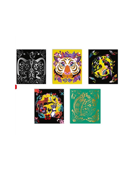 Avec ce kit créatif votre enfant pourra réaliser de beaux portraits d'animaux colorés pour ensuite décorer sa chambre. Il suffit de gratter les tableaux pré-tracés pour voir les animaux se parer de couleurs ! Issu de la collection "Les Ateliers du Calme", ce coffret contient : 5 tableaux à gratter (3 noirs, 1 vert, 1 violet ), avec des effets en couleur ou en dorure, 1 stylet en bois et 1 livret avec modèles et instructions.