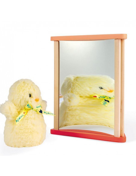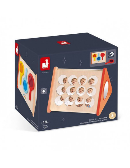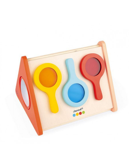 Ce jeu de la marque Janod se compose de divers types de miroirs: miroirs multiples en forme de bulles, miroir normal, miroir convexe et miroir rotatif grossissant. Il contient aussi trois loupes jaune, rouge et bleue pour voir le monde en couleurs.