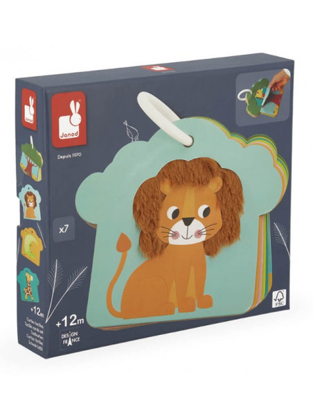 Sur ces cartes en carton, de grandes zones de différentes textures permettent aux petites mains de se familiariser avec les différentes matières : la crinière toute douce du lion ou la peau rugueuse du crocodile.