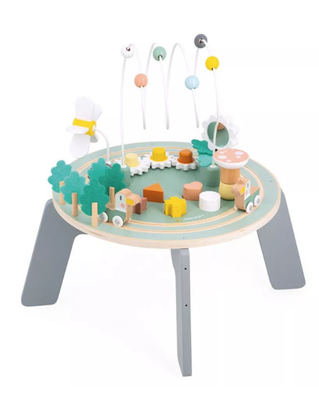 Bébé explore le jardin avec sa jolie table d’activités en bois ! Avec ses 9 activités et sa hauteur ajustable, c’est le jouet d’éveil complet idéal pour les petits dès 12 mois. Au programme : découvertes, motricité et éveil des sens de bébé, le tout dans un tendre univers champêtre. Cette table multi activités propose : 1 grand champignon à empiler, 5 formes de différentes couleurs à encastrer, 1 forêt de 5 arbres en feutrine toute douce, 1 marguerite à empiler avec effet miroir pour s’admirer, 1 grand looping, 3 engrenages en forme de fleurs à faire tourner, 1 champignon avec effet sonore, 2 petits canards roulants sur le rail faisant le tour du plateau ainsi que 1 moulin qui tourne lorsqu’ils passent en dessous. Pour grandir avec l’enfant, ce jouet premier âge s’adapte à 2 hauteurs différentes : 13 ou 22 cm de haut pour le plateau. La variété des couleurs, des formes et des textures permet de stimuler la vue, l’ouïe et le toucher de bébé. Il prendra plaisir à manipuler avec curiosité tout ce que propose sa table d’activités. Avec ses nombreux petits jeux, son style sobre mêlant bois naturel et couleurs intemporelles, la durabilité des matériaux utilisés et son adaptabilité, c’est un jouet complet pour bébé. Installez-vous autour de la table avec votre tout-petit dès 1 an, et montrez-lui les différentes fonctionnalités, puis laissez-le explorer et expérimenter à son rythme ! Cette table multi-activités est composée de bois certifié FSC™