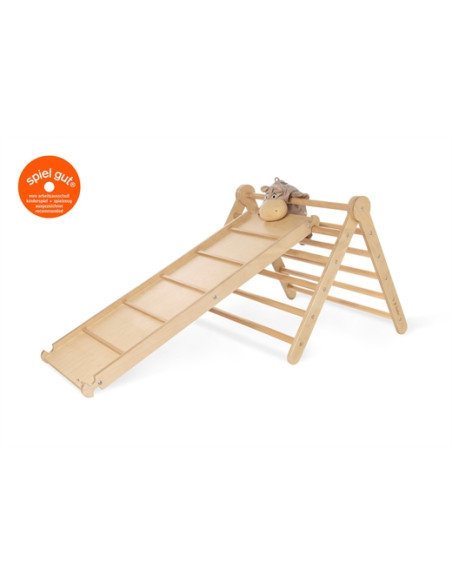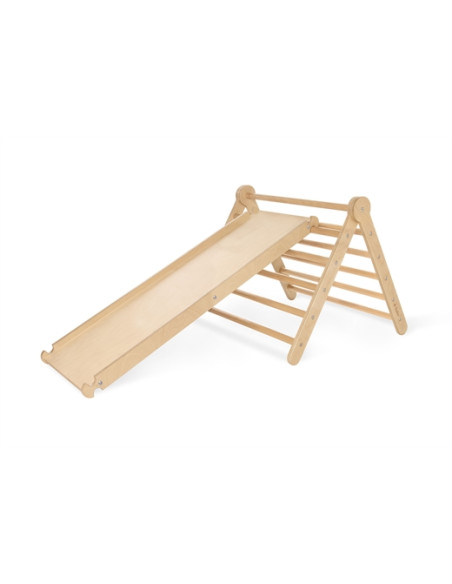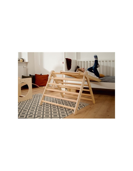En 2 parties : le triangle d'escalade qui peut être utilisé à partir de 12 mois, comme aide debout, par exemple, car la surface a une finition antidérapante. Et la planche d'escalade qui peut être retournée pour être utilisée comme toboggan.