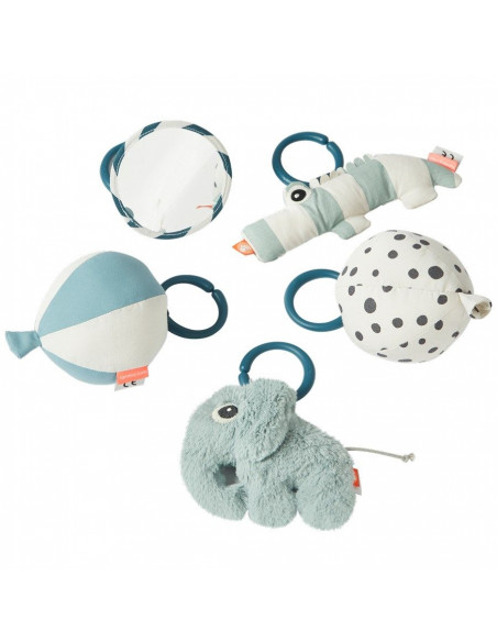 Le tapis est fourni avec 5 accessoires différents: un crocodile, un éléphant, un miroir et deux ballons.