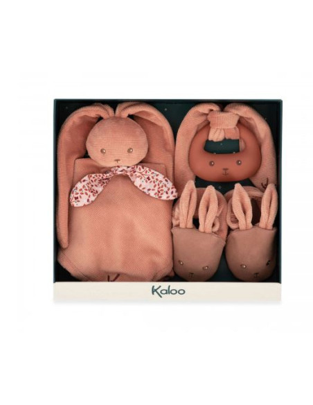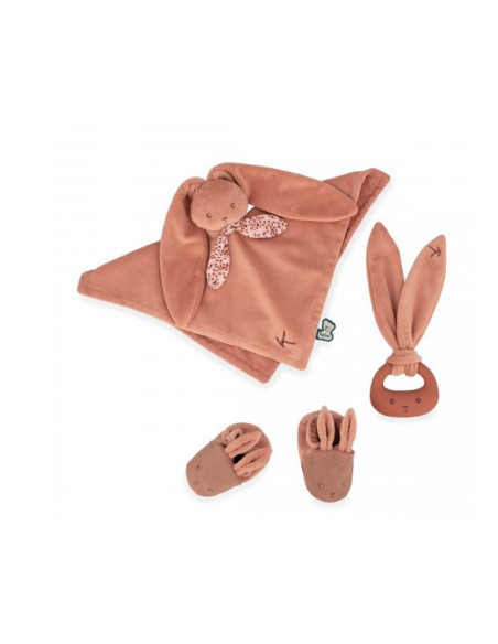 Offrez ce superbe coffret cadeau de naissance contenant 3 indispensables spécialement conçus pour bébé. Ce coffret comprend un doudou lapin, un anneau de dentition en silicone et de charmants chaussons lapin, tous dans une magnifique teinte terracotta.