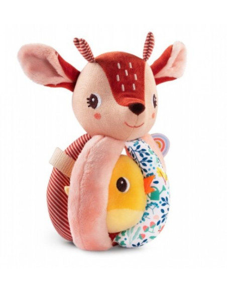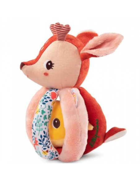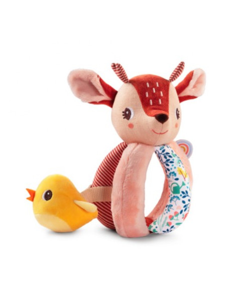 Un anneau en bois naturel, une feuille de chêne en tissu, une feuille avec papier bruissant et un gland munis de grelots. Facile à emporter partout dès la naissance.