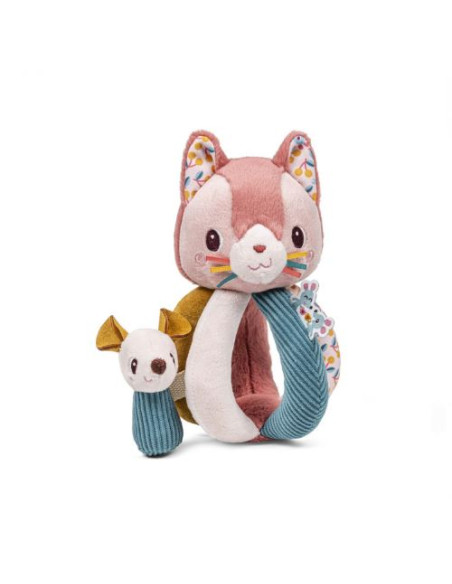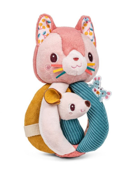 Un hochet original, que les petites mains saisissent facilement. Un petit ami se cache entre les poignées.