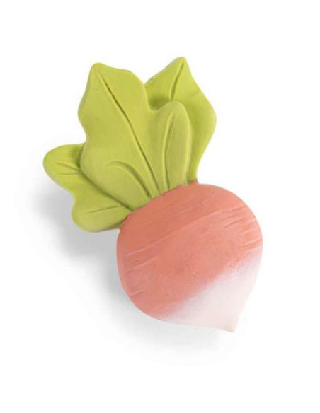 Hochet caoutchouc 100% naturel, issu de la sève d'Hévéa, en forme de croquant petit radis à mâchouiller et/ou à secouer.
