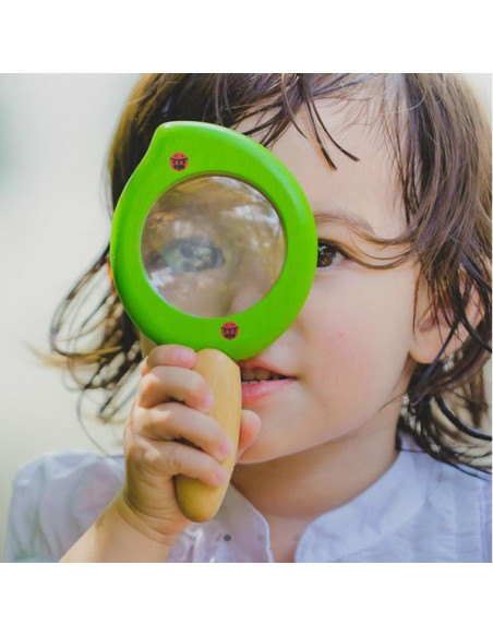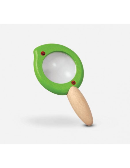 Loupe de la marque Plan Toys, pour explorer le monde de près dès 18 mois! En bois et peinture à l'eau.