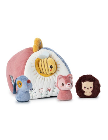 Cette maison en tissu et ses 4 hochets en peluche sont idéals pour éveiller les sens de bébé en douceur.