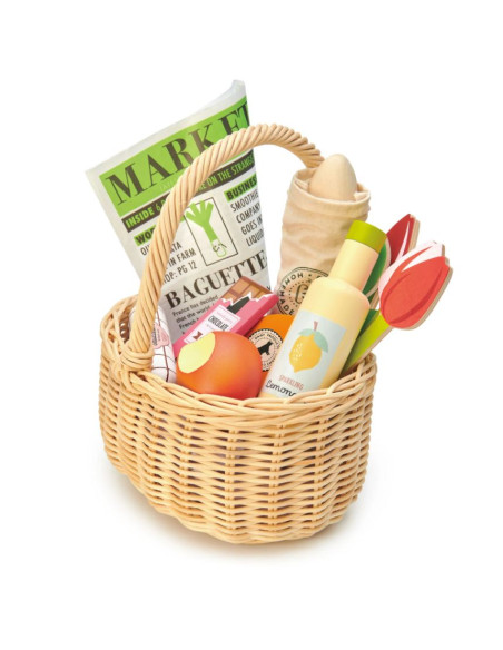 Panier en osier fait main avec 16 pièces en bois : une tablette de chocolat, une bouteille de limonade, un saucisson, du fromage, une baguette dans un sac en tissu, 3 tulipes, une feuille, une pomme déjà croquée et un journal.
