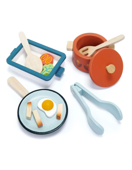 Prépare le repas pour tes amis grâce à tes instruments de cuisine en bois! Comprend une cocotte de style rétro, une poêle, un plat de cuisson, 2 ustensiles de cuisine, une paire de pinces, une tomate, un brocoli, un oeuf et 3 frites.