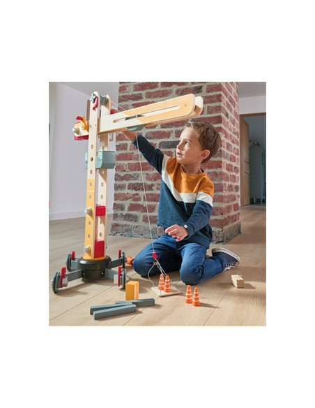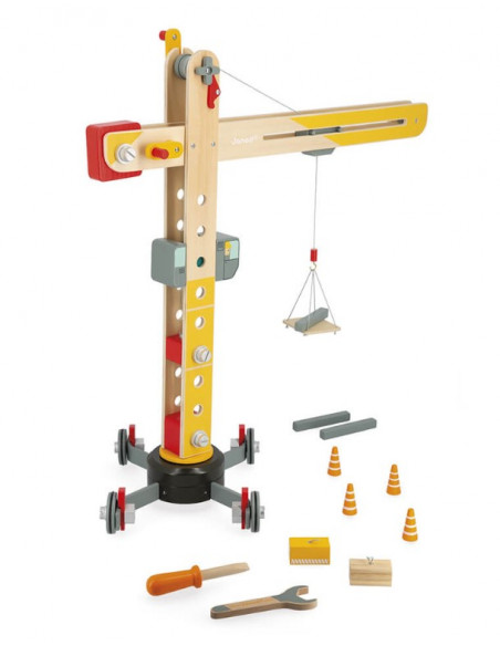 Grande grue en bois, à assembler sur roues, de la marque Janod.