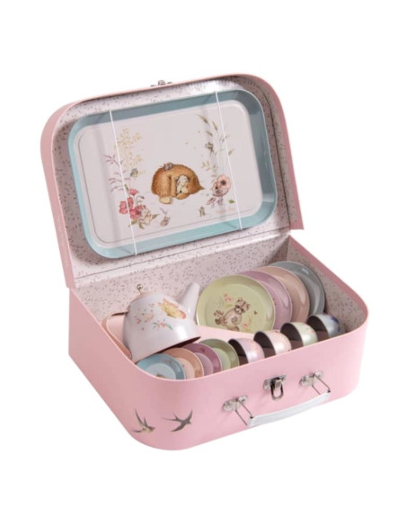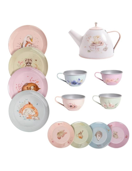 Valise service à thé en métal illustré des fleurs et animaux favoris de nos amies les Rosalie. Elle comprend un plateau, une théière, quatre assiettes à dessert, quatre tasses et leurs soucoupes assorties.