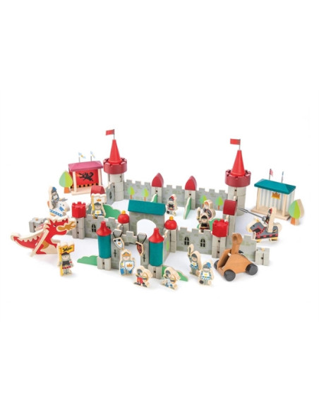 Oyé, oyé ! A toi de jouer avec ce superbe château médiéval en bois, avec ses chevaliers et leur monture, les catapultes, le dragon, etc...
