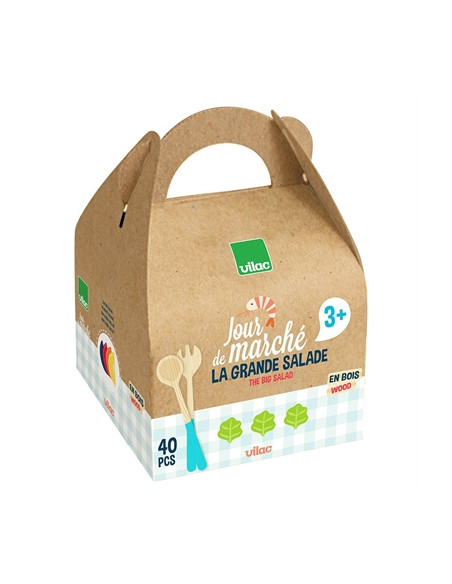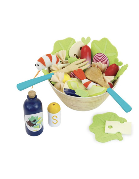 Amuse-toi et compose des salades variées ! Un kit de salades à composer parmi les 40 pièces en bois et feutrine : 1 grand bol en fibre de bambou, 2 couverts à salade, 1 bouteille de vinaigrette, 1 salière, 2 tranches de champignons, 2 tranches d'avocat, 4 tranches de tomate , 2 radis, 2 oignons, 11 farfale , 2 crevettes, 4 feuilles de roquette et 4 feuilles de chêne, 2 tranches de fromage.