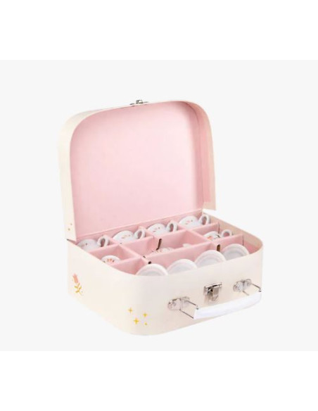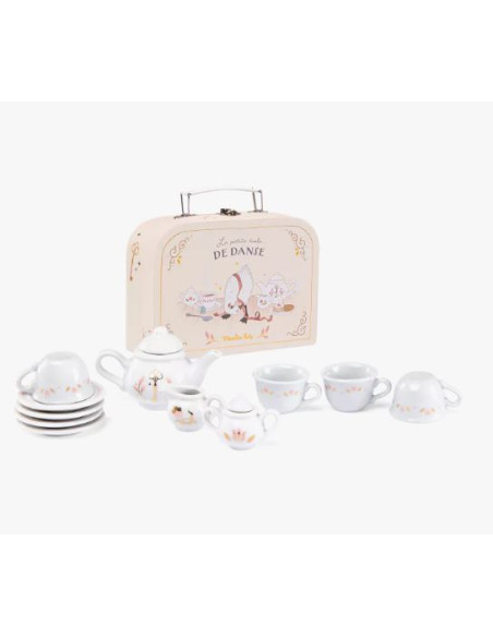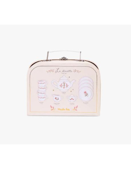 Valise service à thé en céramique illustré. Elle comprend 1 théière, 4 tasses et 4 assiettes, 1pot à lait et 1 sucrier.