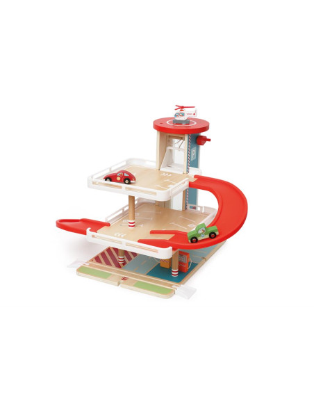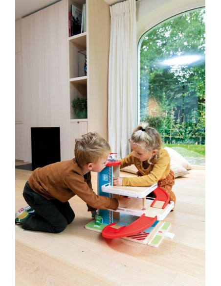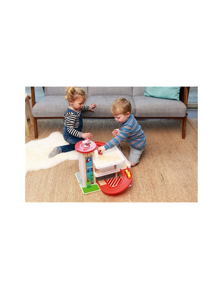 Ce garage est en bois et en plastique, ce qui lui confère un look moderne et ludique. Il égayera à merveille votre salle de jeux !