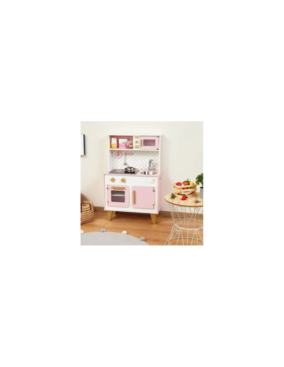 Comme cuisiner c'est toujours un plaisir, Janod vous propose de découvrir la Grande Cuisine Candy Chic couleur bonbon doux et barbe à papa ! La cuisine est un parfait jeu d'imitation qui permet à l'enfant de se construire grâce à de nombreux apprentissages : Il intègre les codes de son environnement qu'il rejoue de manière autonome, il développe son langage, son imagination et sa motricité ! Les cuisinières pour enfants sont donc des jeux complets et très riches ! Cette cuisine en bois rose et doré va faire voyager les enfants à partir de 3 ans aux pays des saveurs sucrées et délicates. Elle est parfaitement équipée et les petits pourront s'imaginer dans une véritable cuisine grâce à ses nombreux accessoires : une patère servant à suspendre la louche en métal, une casserole et un couvercle en métal et trois boites d'aliments en carton (jus d’orange, cacao, sucre). On adore également la plaque à induction sonore à LED ! Il suffit d'appuyer une fois sur les boutons rouges pour que les plaques s'allument, puis une deuxième fois pour entendre le son de l'eau qui bout. Le son et les plaques à induction s'éteignent automatiquement au bout de 30 secondes ou si vous appuyez une troisième fois sur les boutons rouges. Et pour se transformer en véritable petit chef, on ne peut qu'apprécier le four et ses 3 boutons rotatifs avec bruitage, le micro-ondes, le placard pour ranger les accessoires, l'évier en inox et l'horloge, pour toujours garder une organisation millimétrée ! Cette belle cuisine Candy Chic est idéale pour faire de l'art culinaire la grande spécialité de vos enfants ! Ce produit est composé de matériaux certifiés FSC® et de matériaux contrôlés.