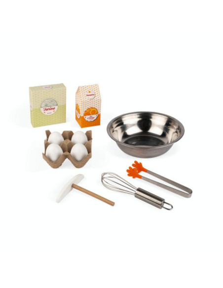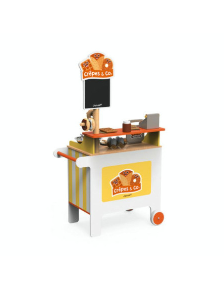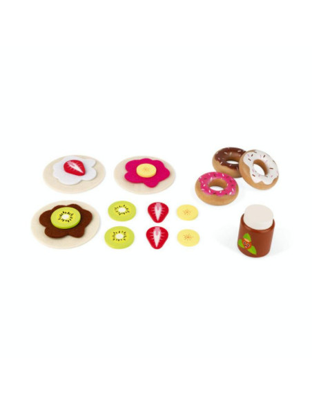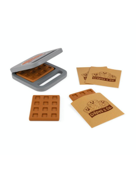 Ce jouet contient 40 accessoires : 1 caisse enregistreuse, 1 set de pièces et de billets, 1 gaufrier, 3 gaufres, 3 donuts, 1 boite de 4 oeufs, 1 pot de pâte à tartiner,