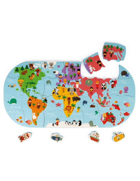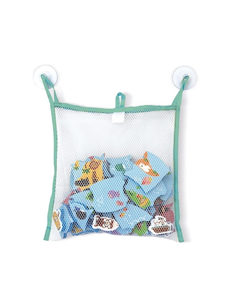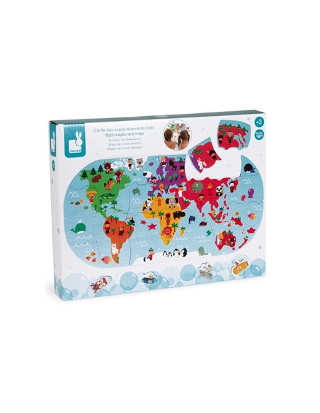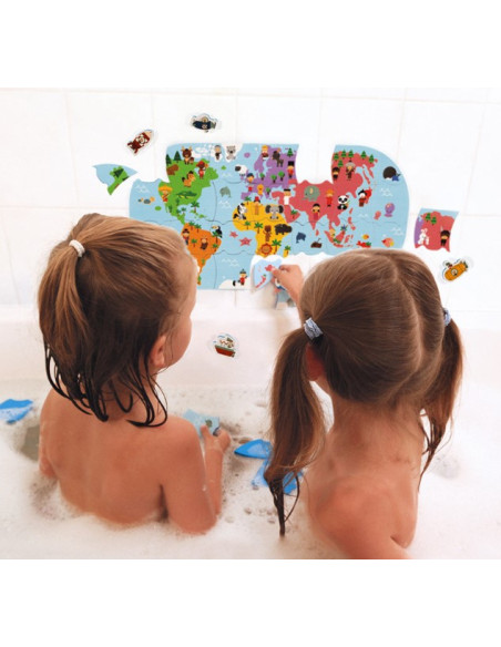 Avec cette carte du monde de 28 pièces à assembler dans le bain, votre enfant va s'amuser à parcourir le monde grâce aux 4 figurines véhicules pour circuler à travers le monde, dans les airs où sous les mers, ... Magique ! En trempant les pièces dans l’eau, elles flottent et tiennent sur la faïence ! Une fois terminé, la carte se range dans son filet, qui s’accroche grâce à ses ventouses sur les murs.