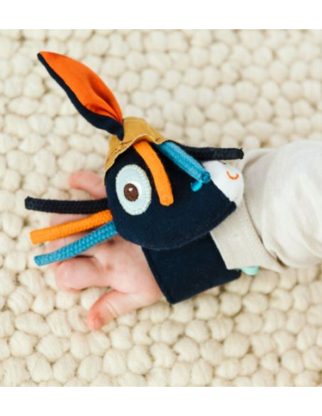 Ce hochet en coton bio s’attache facilement autour du poignet ou de la cheville. Peut convenir aux touts petits qui ne savent pas encore prendre les objets. Il fait un bruit de hochet à chaque mouvement pour le plus grand plaisir de bébé.