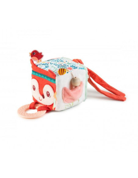 Cube d'activités Alice avec divers motifs et textures. Comprend un miroir, du bruit papier, une perle à faire glisser dans une pochette, un anneau de dentition et des grelots dans le cube. S'attache grâce au ruban.