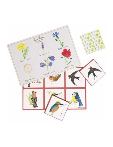 Ce loto est composé de 6 planches et de 36 cartes illustrées. Sur chacune d'entre elles, nous retrouvons différents dessins à l'aquarelle sur le thème du jardin.