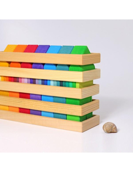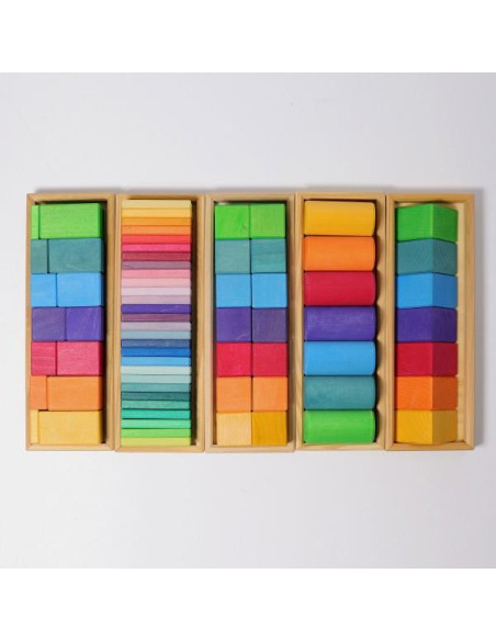 Également idéal pour la maternelle: chaque enfant (ou toujours deux) peut choisir une couleur et construire une maison avec les blocs correspondants, créant une petite ville colorée composée de sept maisons de couleurs différentes.