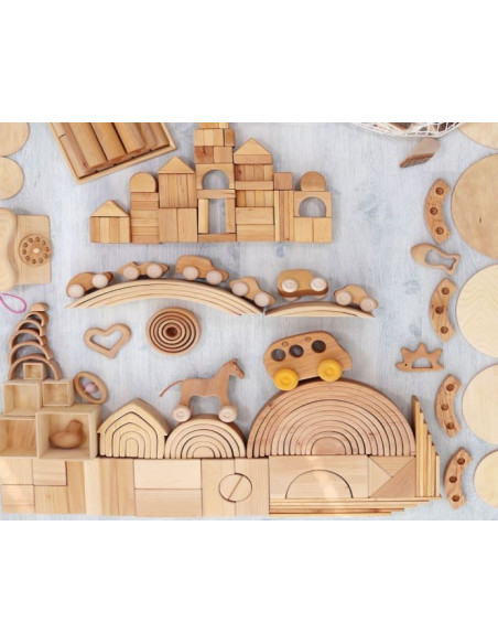 Pour empiler, trier et construire, au fur et et à mesure que les enfants grandissent, ils l'utiliseront comme berceau pour les poupées, comme clôture pour les animaux, comme tunnel ou pont pour les véhicules, comme maison pour les nains et les poupées, construisent des sculptures étonnantes...