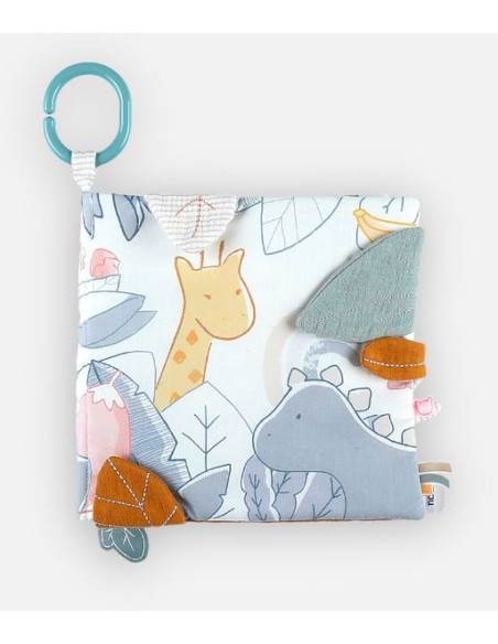 Ce livre en popeline et mousseline de coton est un livre illustrant l'histoire de nos petits personnages Tiga, Stegi & Ops.