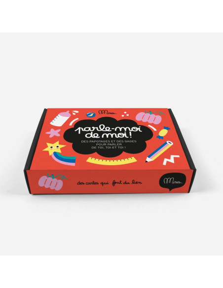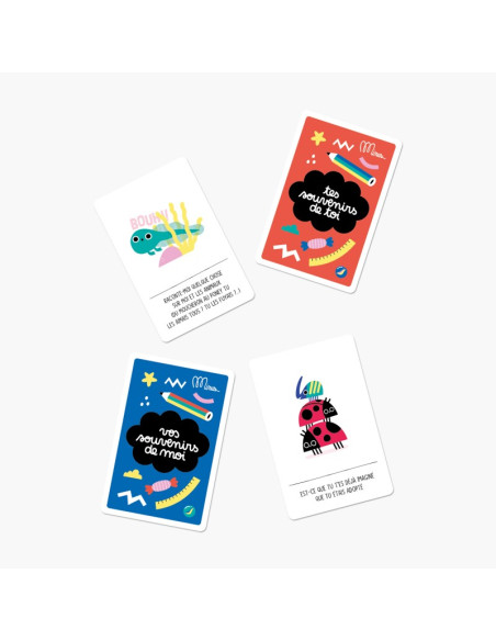 L’enfant pioche une carte « vos souvenirs de moi » pour interroger ses parents qui, à leur tour, piochent une carte "tes souvenirs de toi" pour questionner leur chérubin.