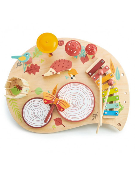 Compose une symphonie de la forêt! Les notes de musique roulent sur le xylophone, les clochettes en forme de champignons tintent lorsque tu les frappes avec les baguettes glands. Frappe les tambours en forme de tronc d'arbre, souffle dans l'oiseau, agite les ailes du papillon, fait résonner un écho avec le carillon en bois qui s'agite. Frotte le bâton sur le dos du hérisson, quelle jolie mélodie !