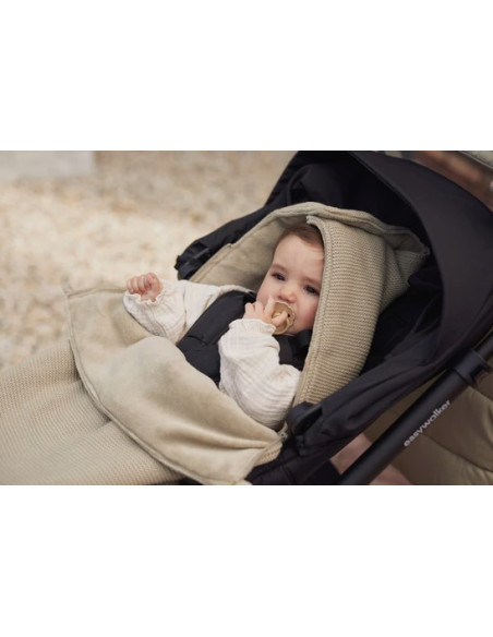 Cette chancelière en tricot de Jollein est rembourée et a un intérieur en polaire. Elle convient pour une utilisation avec ceinture de siège 3 ou 5 points. Une capuche peut être créée par le haut simplement avec les boutons pressions.