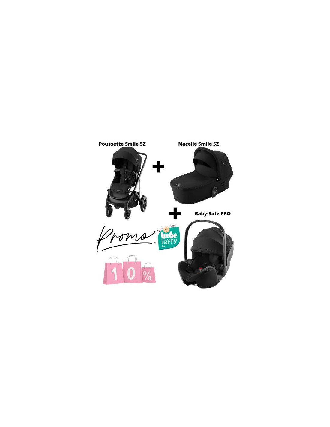 Pack trio composé d'une poussette Smile 5Z, d'une nacelle Smile 5Z et du siège coque Baby-Safe PRO.
