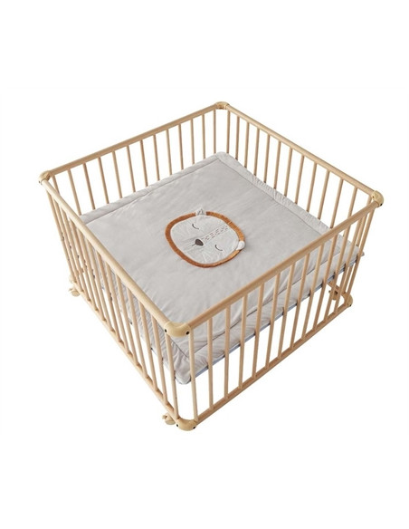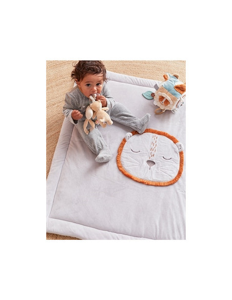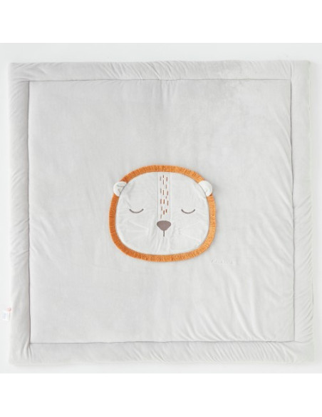 Le tapis de jeu et de parc, compact et transportable, en Veloudoux gris clair brodé de Babou le lion a été conçu pour garantir un confort optimal et dispose d'un rembourrage généreux.