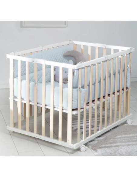 Le rembourrage latéral protège votre enfant des chocs sur le lit et des courants d'air. Grâce aux sangles latérales, l'insert du parc peut être facilement et solidement fixé aux barres du parc.
