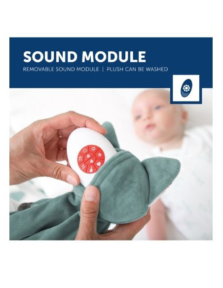 La peluche de la marque ZAZU produit différents sons comme des battements de coeur, des bruits blancs, des sons de la nature et une boucle de berceuses pour endormir votre enfant.